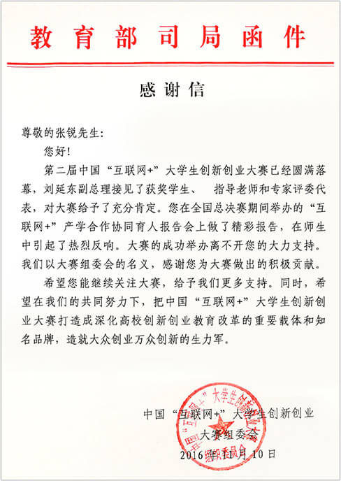 2018年,雨燕直播连续多年为中国国际互联网+大学生创新创业大赛做出积极贡献,获教育部来函致谢。